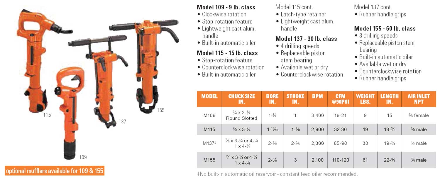 Weighing only 61 lbs, the APT Model 155 Rock Drill can be used in general construction as well as in utility work and plant maintenance. It is designed for drilling through granite, hard faced rock, quarry drilling, and drilling secondary holes for blasting. This tool can also be used with dowel hole drilling machines. Adaptable to wet drilling applications by attaching the APT valve, wet tube and swivel assembly.