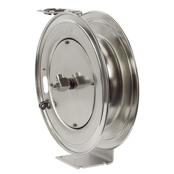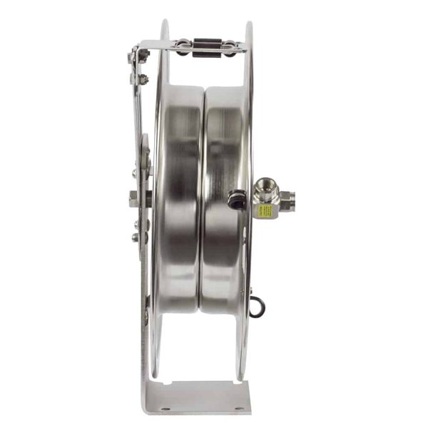 Stainless Steel Spring Rewind Hose Reel: 3/8″ I.D., 50′ hose capacity, less hose, 3000 PSI