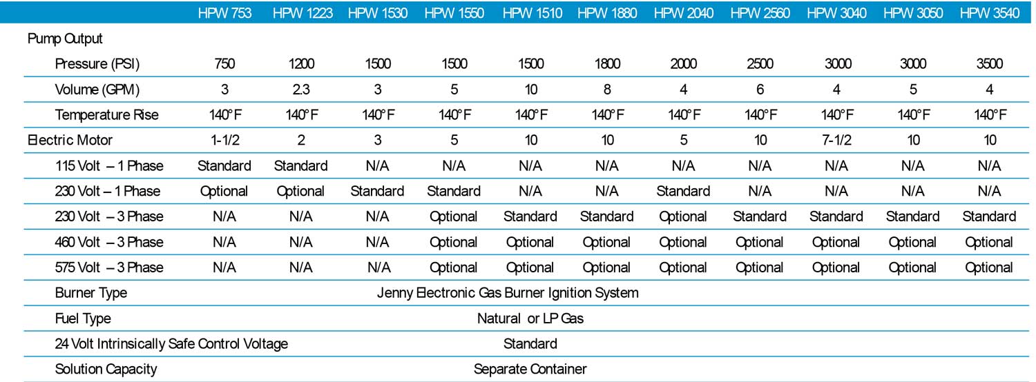 All the Jenny HPW gas fired units come standard with the following features; 24 Volt Intrinsically Safe Control Voltage, Nozzle (or Trigger Gun) Control, Over Pressure Protection, High Temperature Protection, a Ground Fault Circuit Interrupter (Single Phase Units Only), 0,15,25,40 Degree High Pressure Nozzles, and 50 Feet of 3/8″ Quick Coupled Hose.