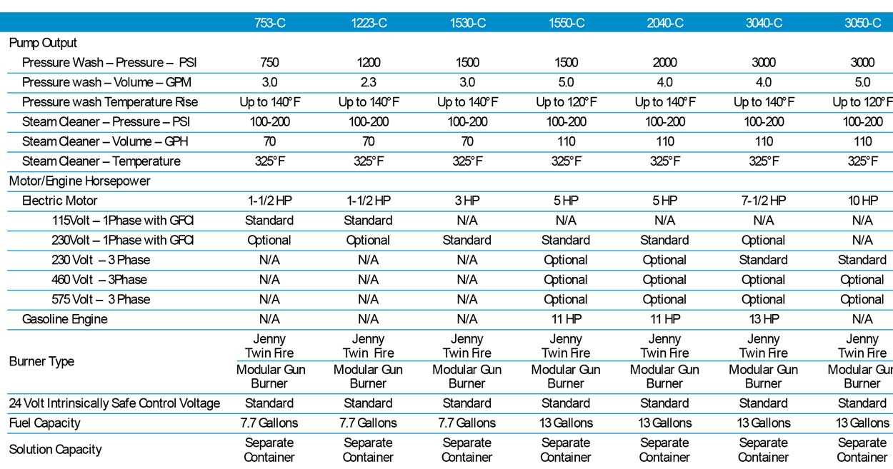 The high performance, heavy-duty heated units will clean any task both quickly and effectively. Pressures in the pressure wash mode range from 750 to 3000 PSI and volumes range from 2.3 to 5.0 GPM, they will make short work of fleet, farm, and construction equipment cleaning, light degreasing, floor and building cleaning. And if the work warrants it, simply change the tip in the end of the gun and flip a switch and the unit becomes a powerful steam cleaner for superior degreasing and sanitizing ability.