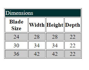 | Blade Size | Model | H.P | R.P.M. | Shp. Wgt. | 0″ S.P. | CFM 1/8″ S.P. |