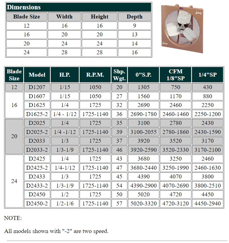 Designed for large volume circulation, the 12″ to 24″ direct drive fans meet all OSHA specifications. These rugged units are designed for operation in any position and are ideal for all commercial and domestic facilities. These units offer minimum maintenance and efficient, economical operation in all weather conditions. They are ideal for inaccessible areas where servicing is difficult.