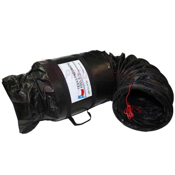 Our air ducting (TX-SAC-N-GO) is available in five sizes, 8″, 12″, 16″, 20″ and 24″ diameters. The standard ducting is made of single-ply, PVC coated polyester fabric with a spring steel wire helix and external PVC wear strip. Electrically conductive ducting has carbon impregnated into the PVC coating and has a ground wire that runs the length of the duct. The ground wire will safely discharge any potential static buildup. The ducting was tested to UL 94 Standard and certified as fire retardant.